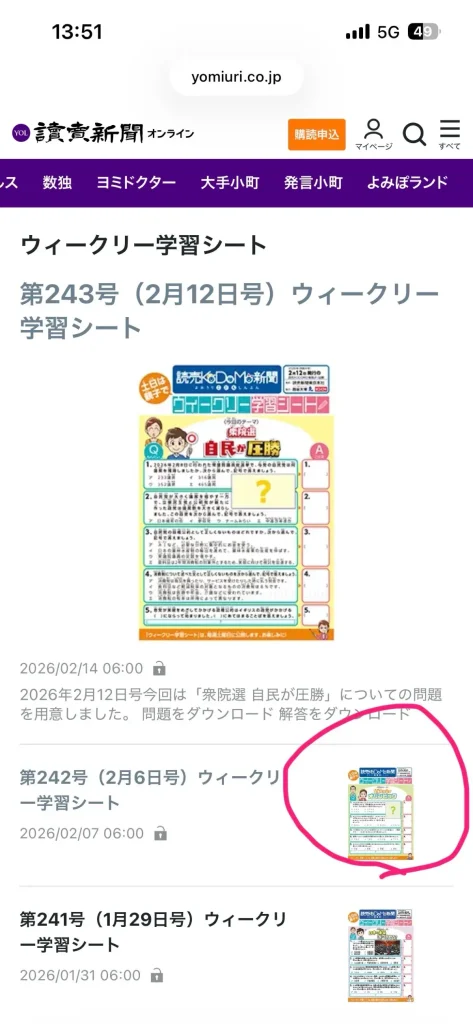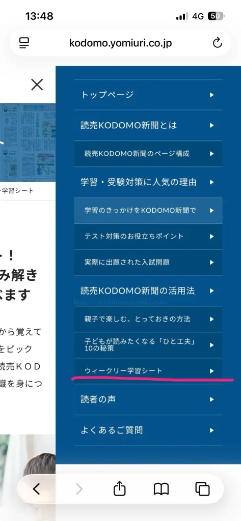 2. 読売KODOMO新聞の項目に行きウィークリー学習ノートを選ぶ