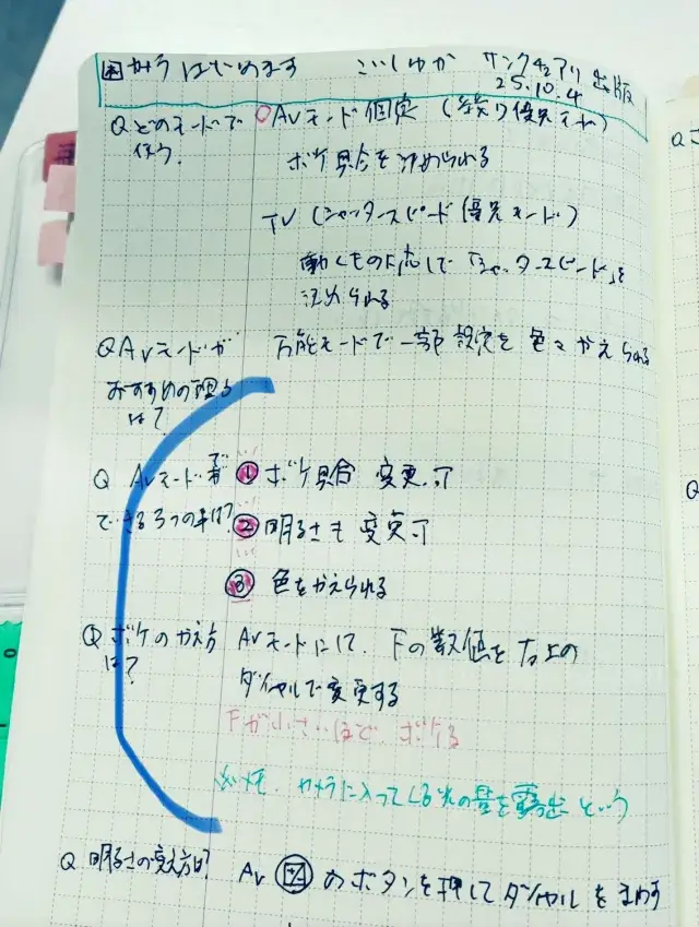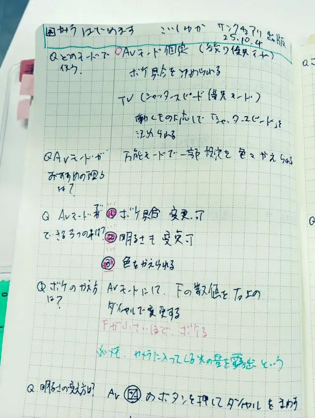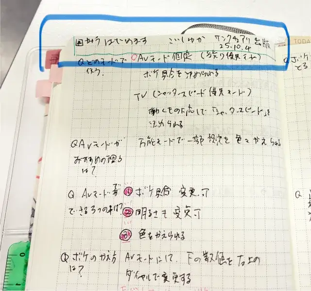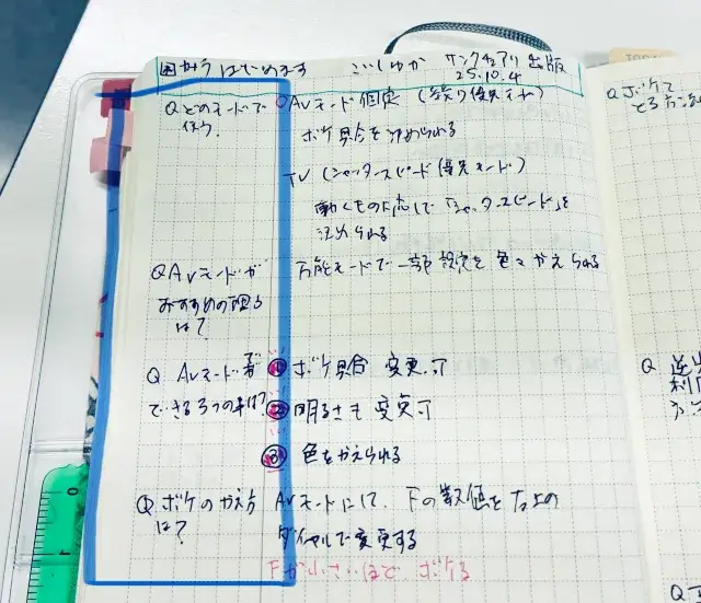 ポイントには赤と緑のペンを使ってます。赤ペンは箇条書きのナンバーを塗ったり、緑ペンは注目ポイントを書いてます。